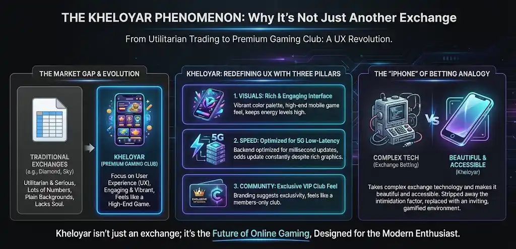 To understand Kheloyar, you have to understand the market gap it filled. Platforms like Diamond Exchange or Sky Exchange are “Utilitarian.” They are like stock trading terminals—lots of numbers, plain blue and white backgrounds, very serious. They work, but they lack soul.