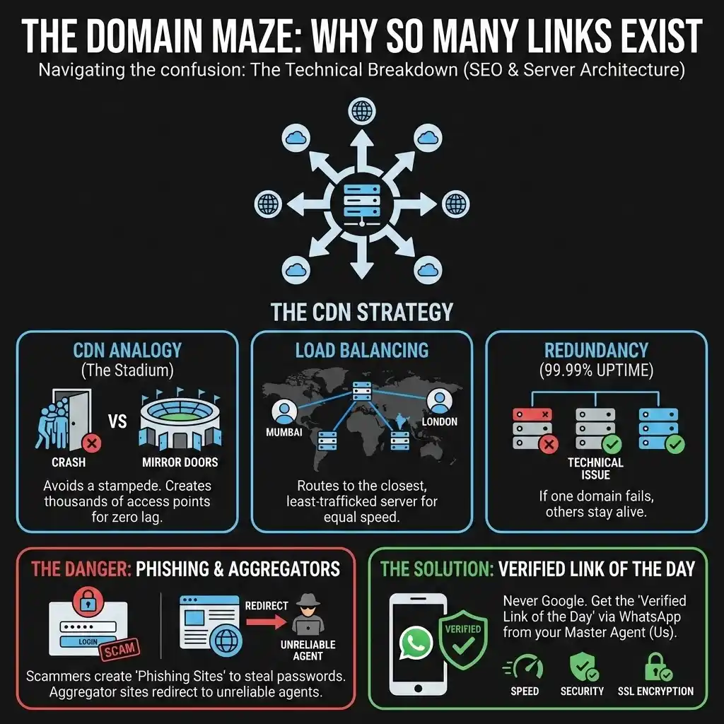 - Redundancy: If one domain faces technical issues (DNS block, ISP filtering, or server maintenance), the others stay alive. This guarantees 99.99% uptime.