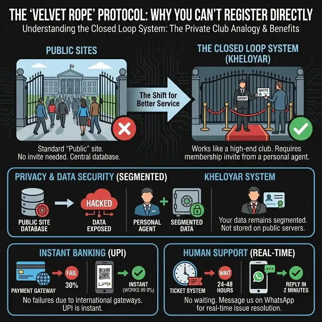 - Privacy & Data Security: In a standard “Public” site (like Dream11), you upload your PAN card, Aadhar, and bank details to a central database. If that database is hacked, your data is exposed. In the Kheloyar system, you deal with a personal agent. Your data remains segmented. We don’t store sensitive documents on public servers.