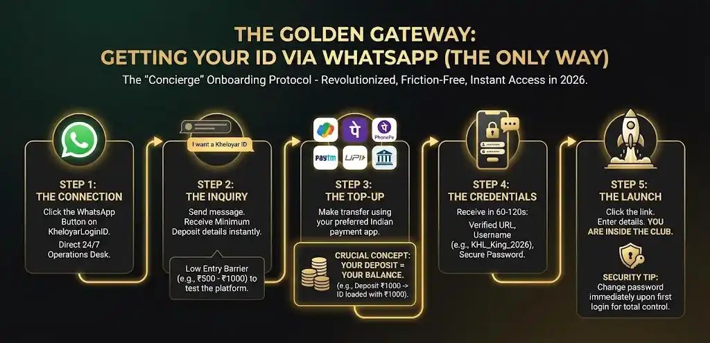 Step 1: The Connection Click the WhatsApp Button prominently displayed on our website (KheloyarLoginID). This is your direct line to our 24/7 Operations Desk.