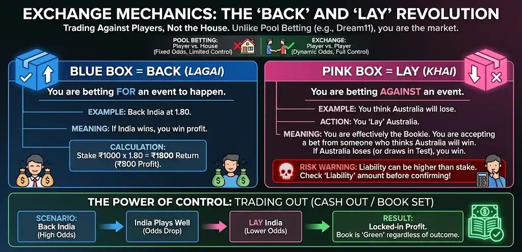 - Scenario: You Back India. India plays well. The odds drop. You then “Lay” India at the lower odds.