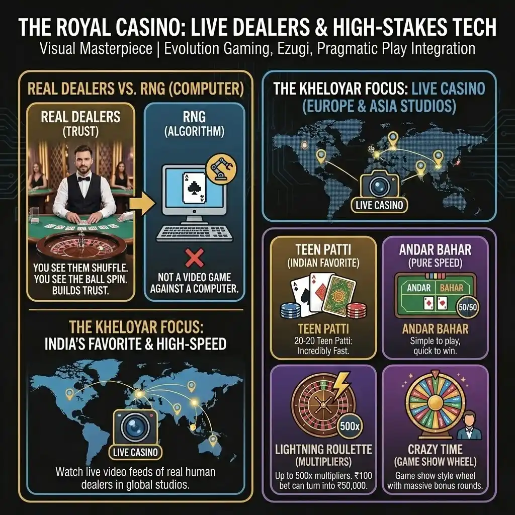 Kheloyar focuses on Live Casino. You are not playing a video game against a computer algorithm. You are watching a video feed of a real human dealer in a studio in Europe or Asia.